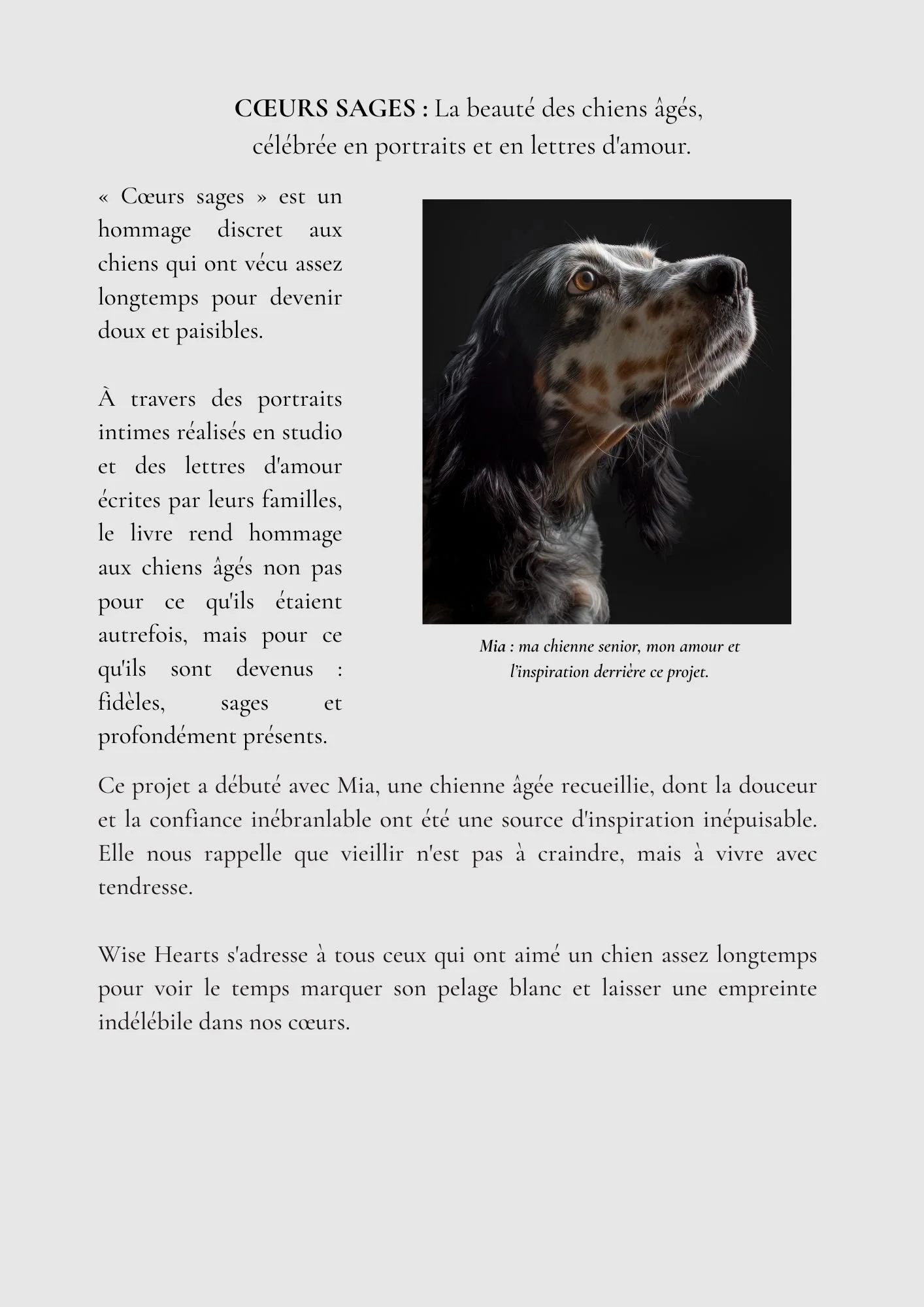 Ce projet a débuté avec Mia, une chienne âgée recueillie, dont la présence bienveillante et la confiance inébranlable ont inspiré tout ce qui a suivi. Elle nous rappelle que vieillir n'est pas à craindre, mais à observer avec tendresse.